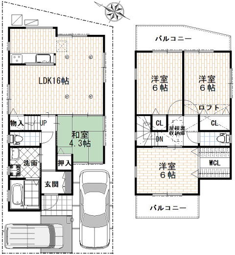| 土地面積:85.01㎡ 建物面積:延べ面積90.72㎡ 1F48.60㎡ 2F42.12㎡ |